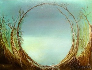 Like these circle trees. The earlier one is quite small(40/50cms) and mostly blue, green and umber. After a while an idea grew to make a larger circle combined with the planetary view as it occurred in another composition. The idea of a circle of trees coinciding(or not) with other circular forms seemed inevitable. So the latest project is this larger painting showing red planets and trees.